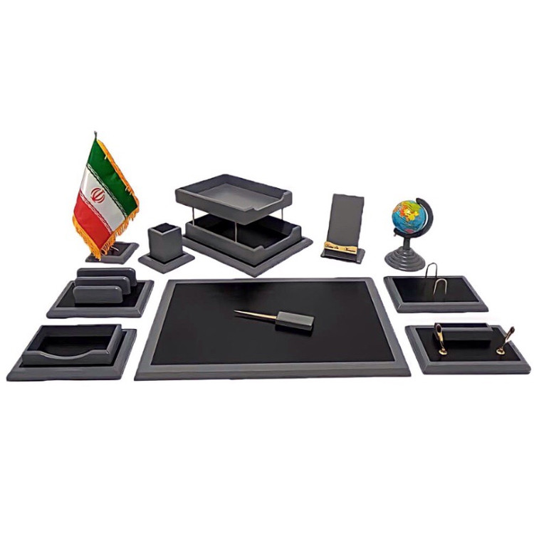 این مجموعه 11 عددی شامل یک زیر دستی بزرگ به ابعاد 60 در 40 (جهت قرار گیری در زیر دست هنگام نوشتار) ، هلدر گوشی موبایل چوبی، جامدادی رومیزی ، استند خودکار ، پایه تقویم ، جای کاغذ یادداشت ، کازیه دوطبقه سایز A4 ، نگهدارنده نامه ، پرچم جمهوری اسلامی ایران(به همراه پایه) ، یک کره زمین تزیینی و یک چاقوی نامه باز کن است که همگی آنها از جنس چوب طبیعی به همراه روکش رنگ مرغوب ساختهشده اند و برای داشتن یک میز کار منظم بسیار کاربردی میباشد.