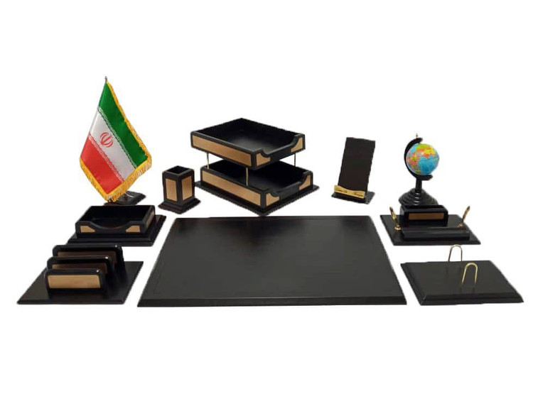 این مجموعه 11 عددی شامل یک زیر دستی بزرگ به ابعاد 60 در 40 (جهت قرار گیری در زیر دست هنگام نوشتار) ، هلدر گوشی موبایل چوبی ، جامدادی رومیزی ، استند خودکار ، پایه تقویم ، جای کاغذ یادداشت ، کازیه دوطبقه سایز A4 ، نگهدارنده نامه ، پرچم جمهوری اسلامی ایران (به همراه پایه) ، یک کره زمین تزیینی و یک چاقوی نامه باز کن است که همگی آنها از جنس چوب طبیعی به همراه روکش رنگ مرغوب ساخته شده اند و برای داشتن یک میز کار منظم بسیار کاربردی میباشد.